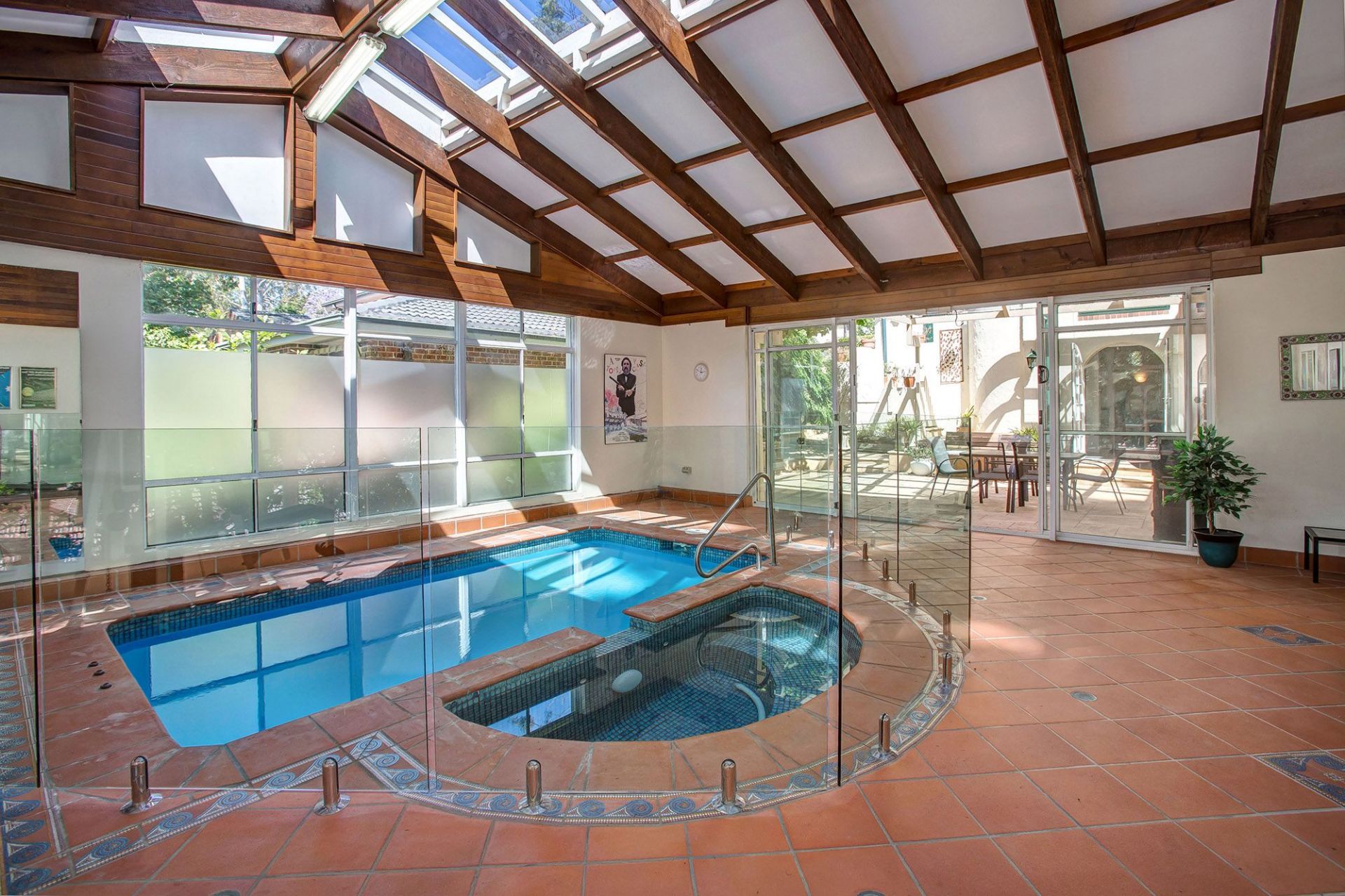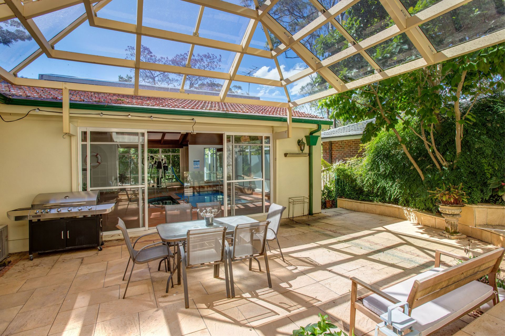 -private and sunny courtyard has a stunning atrium style roof for all-weather comfort