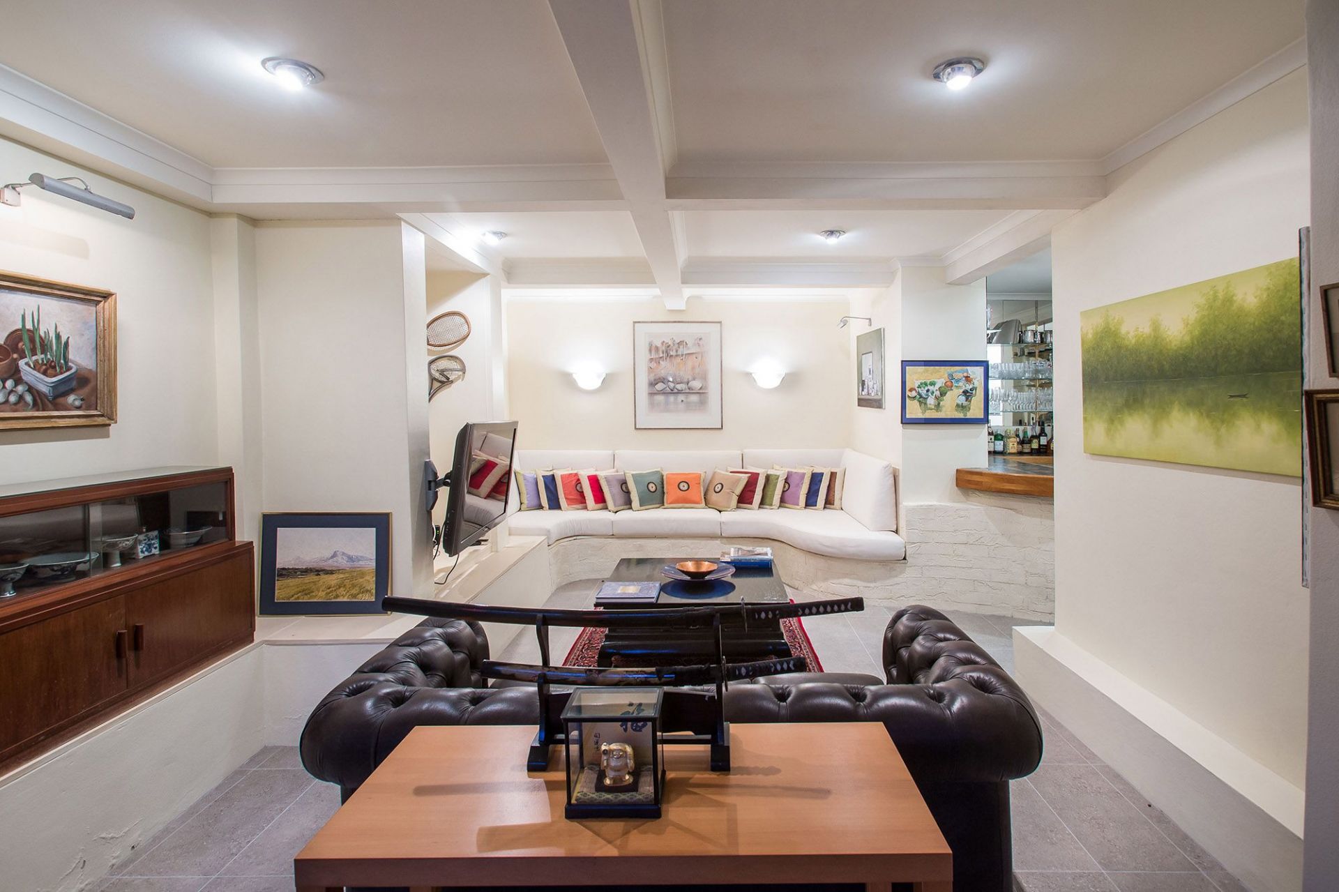 Downstairs, the generous family rumpus has banquette seating and a bar for easy entertaining flowing out to the magnificent atrium style courtyard. Housed in a spectacular and light-filled enclosure, the indoor pool and spa entices year-round use with the pool, and an adjacent open plan gym.