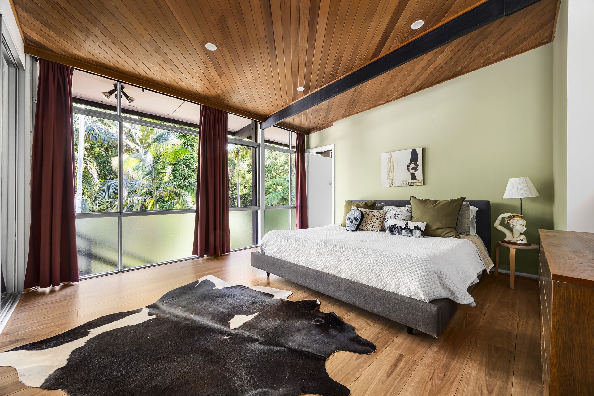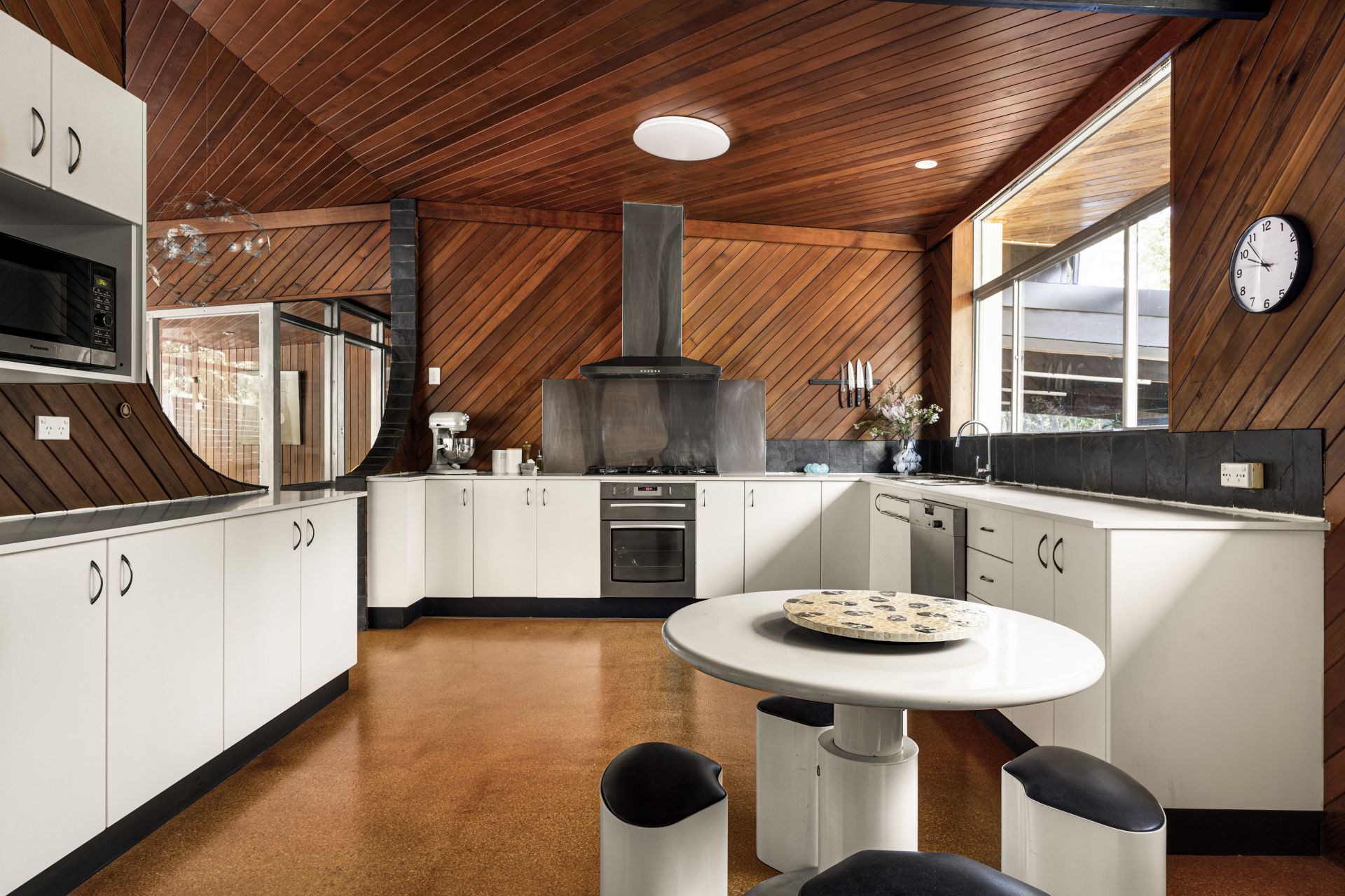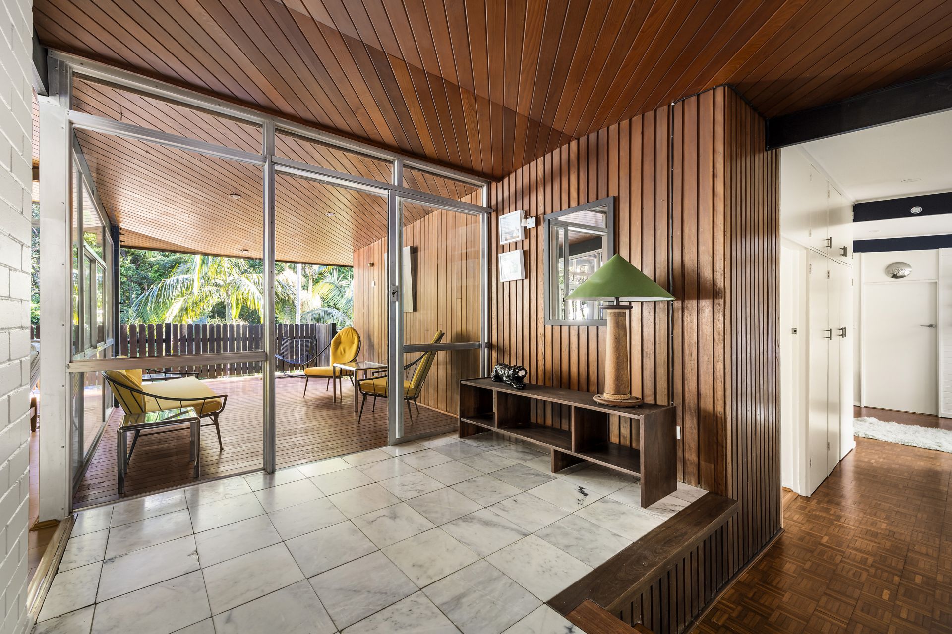 - Original raked ceilings, timber panelling and full-height glazing