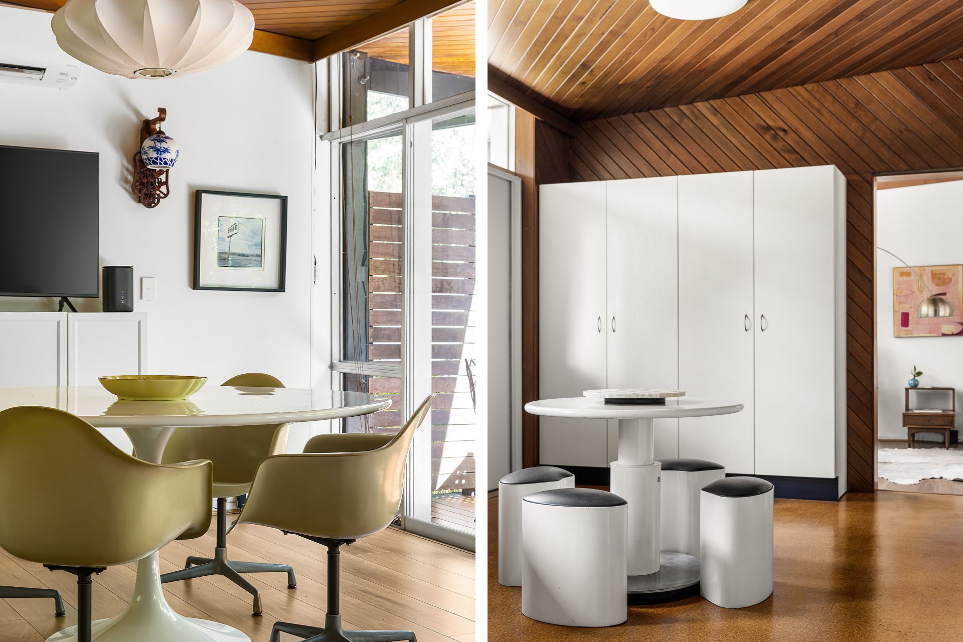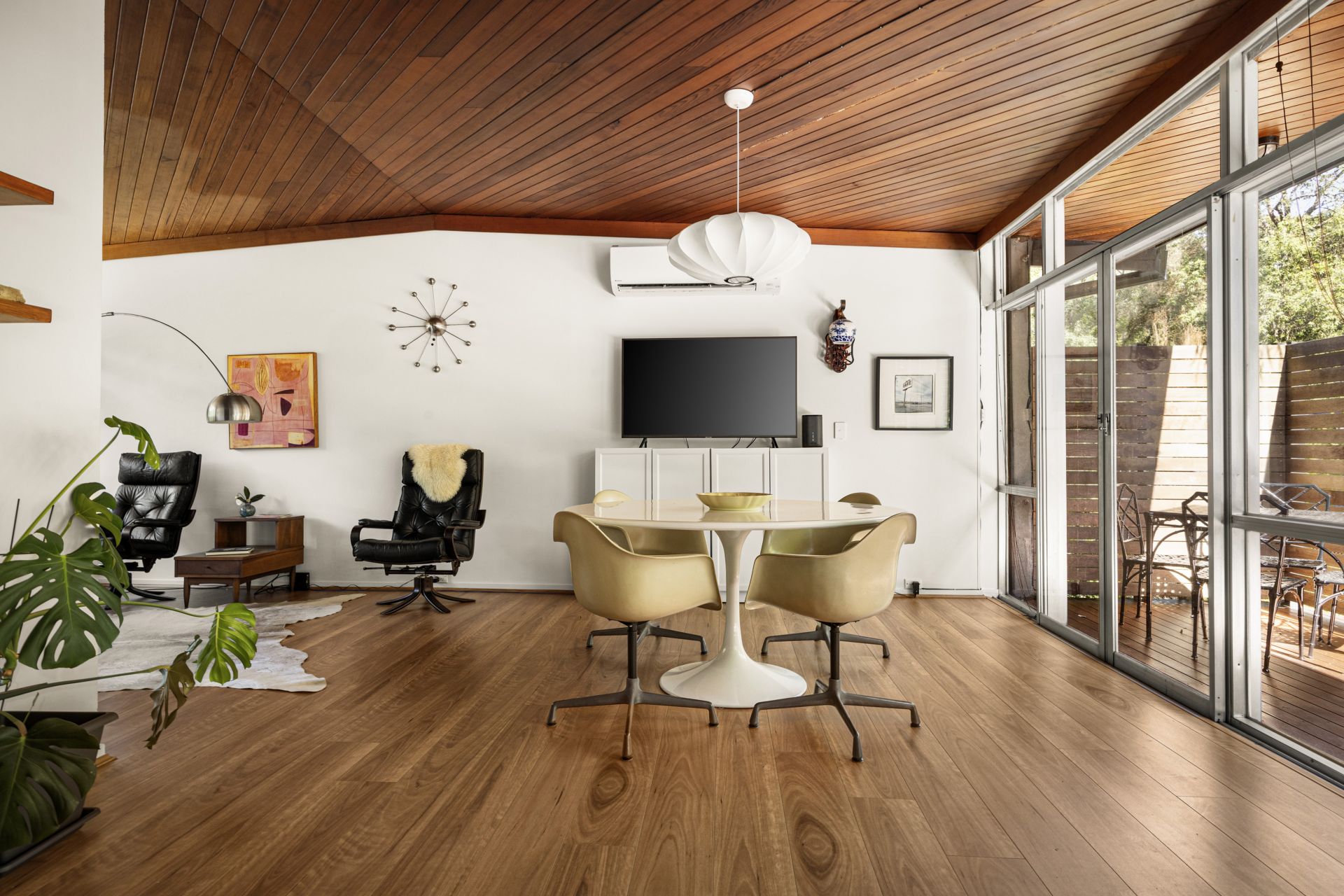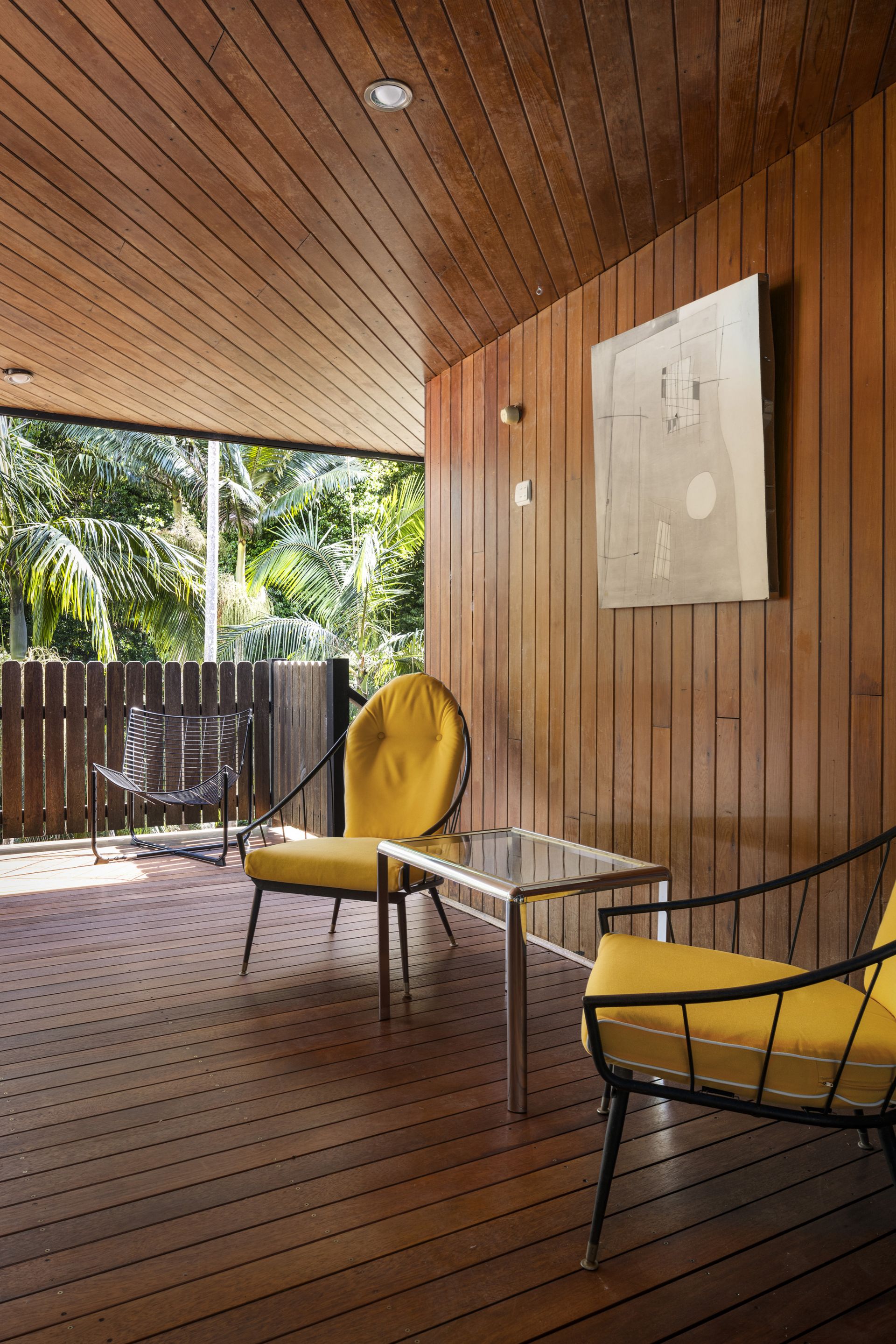 - Original raked ceilings, timber panelling and full-height glazing