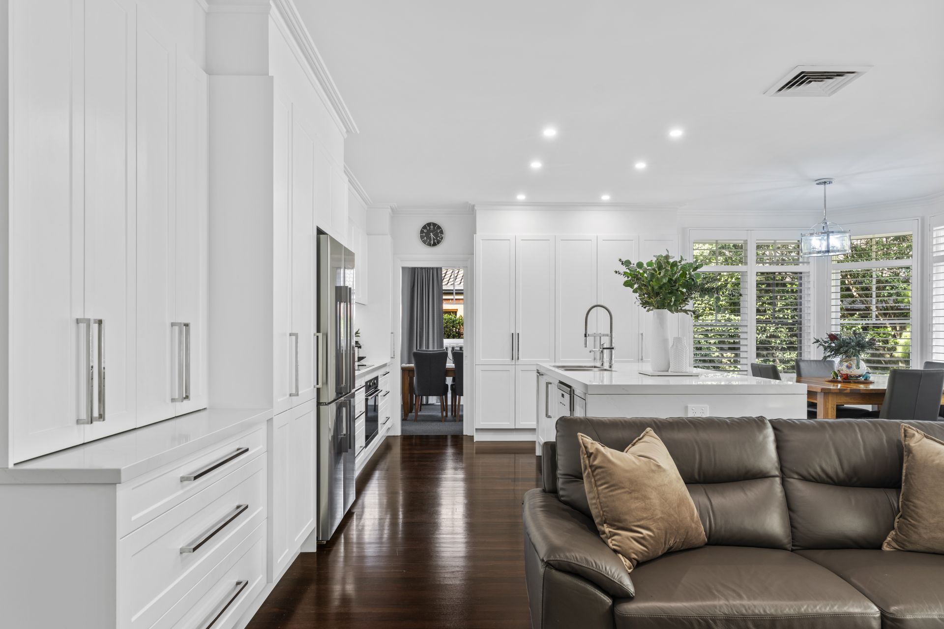 Stepping inside, you'll be welcomed by high ceilings, warm timber floors, and an abundance of natural light. The gourmet kitchen, centered around a 2.7m x 1.3m Caesarstone breakfast bar, flows effortlessly into the casual meals and living areas, while a formal lounge and dining room with a Jetmaster fireplace adds a touch of timeless sophistication-ideal for entertaining or relaxed family gatherings.